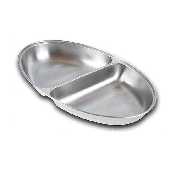 This 20-inch divided vegetable dish, made from polished stainless steel, is a great choice for serving two types of vegetables neatly at events like gala dinners or corporate gatherings. Its two compartments help keep foods separate and warm, making it easier for staff to serve and improving the overall dining experience.