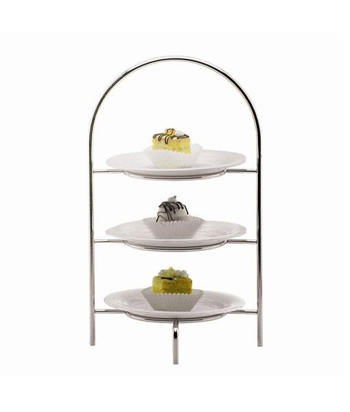 If you’re hosting an afternoon tea event, a 3-tier cake stand makes a great addition to your catering setup. This stand has a polished chrome finish and can hold three 8-inch plates, which are available to rent separately.