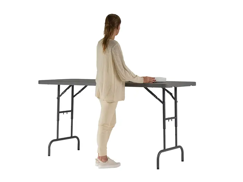A high poly table is a practical, elbow-height bar-style unit with a molded plastic surface, designed for durability and ease in busy settings like catering kitchens or event prep areas. It’s lightweight, sturdy, and simple to wipe clean, making it ideal for tasks such as food preparation or serving in hygiene-sensitive environments.