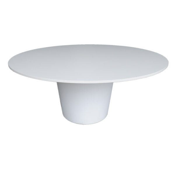 This round conical table is a great choice for setting up a modern and elegant dining area, with its sleek white melamine top and angled pedestal base providing a clean, stylish look. It measures 5 feet 6 inches across and seats up to 10 people comfortably, offering plenty of legroom without any awkward legs in the way, making it ideal for banquets, corporate dinners, or special events.