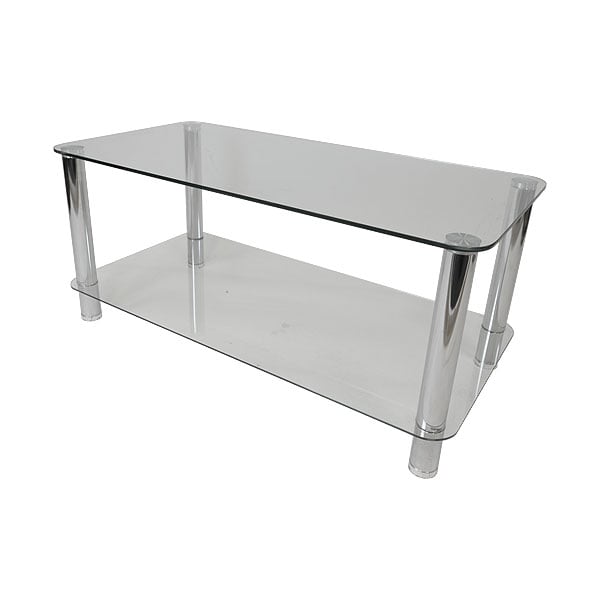This two-tier glass and chrome coffee table combines modern style with practical features, making it a great choice for events like trade shows or conferences. Its sleek frame and clear glass shelves offer space for displaying materials or setting down items, while adding a clean, professional vibe to any setup. It’s durable and easy to maintain, fitting well in lounge areas or corporate spaces to keep things organised and inviting.