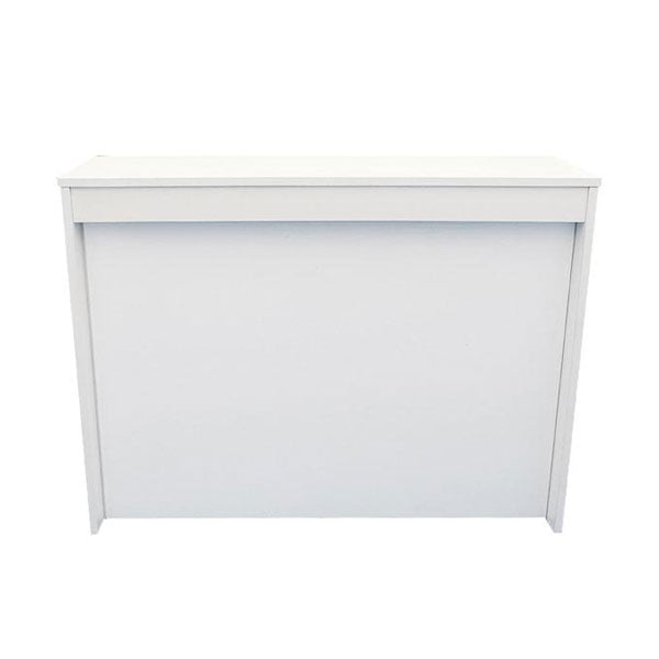 This white reception desk offers a clean and professional look, making it a great choice for events, exhibitions, trade shows, or temporary offices. Its compact design and easy setup allow it to fit seamlessly into different spaces while providing a functional spot for registration or guest greetings. Paired with simple add-ons like stools, it helps create an organised and welcoming environment without breaking the bank.